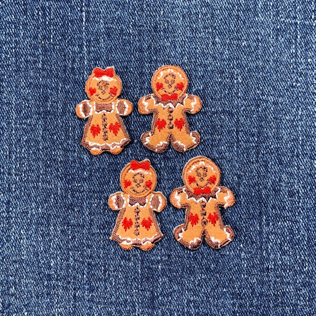 4-Pack Gingerbread Man & Woman Applique Patch Set - Embroidered Christmas Cookie Badges 1.25" (Iron On)