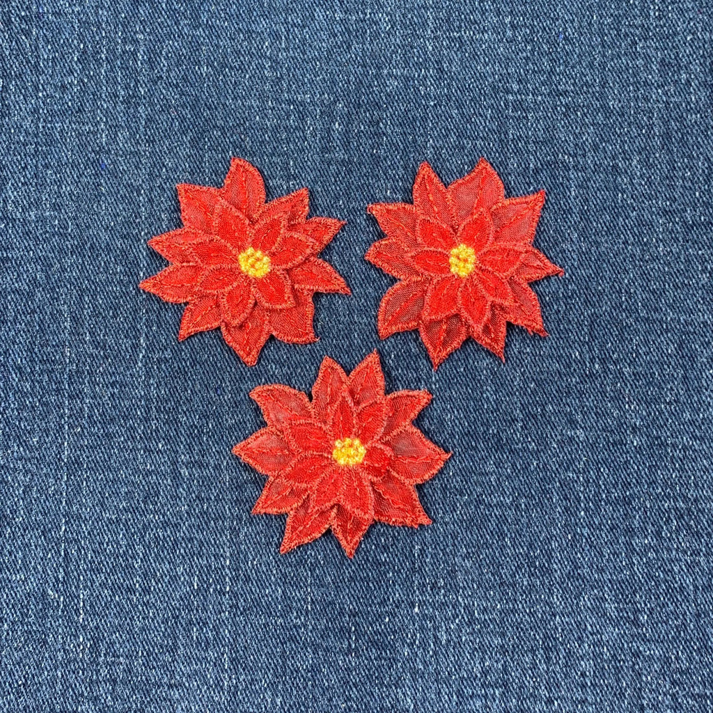 3-Pack Red Poinsettia Applique Patch - Embroidered Layered Christmas Flower Badge 1.75" (Iron On)