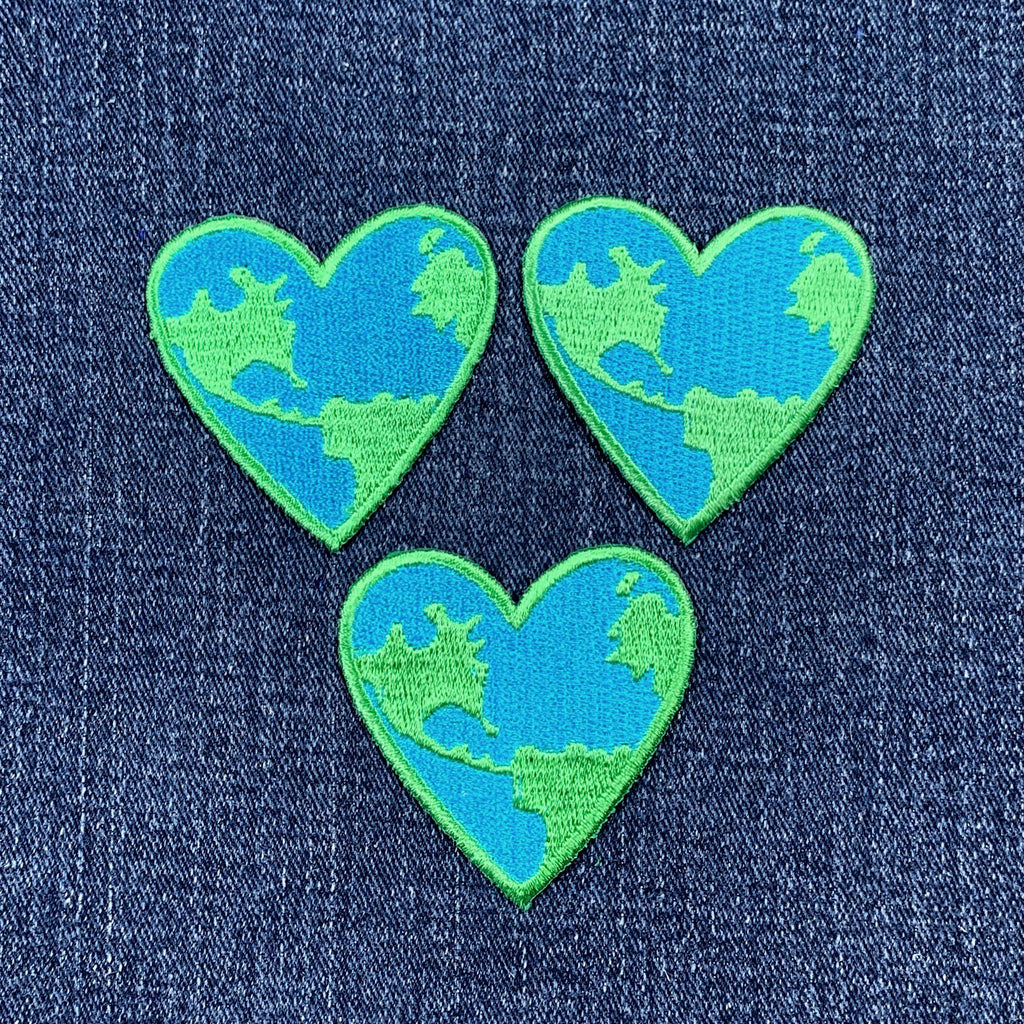 3-Pack Heart World Applique Patch - Embroidered Earth Day Badge 2" (Iron On)