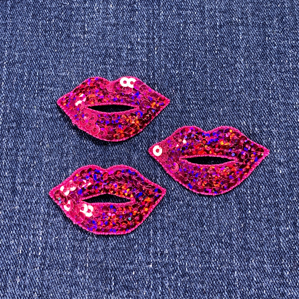 3-Pack Pink Lips Applique Patch - Embroidered Sequin Fuchsia Badge 1.75" (Iron On)