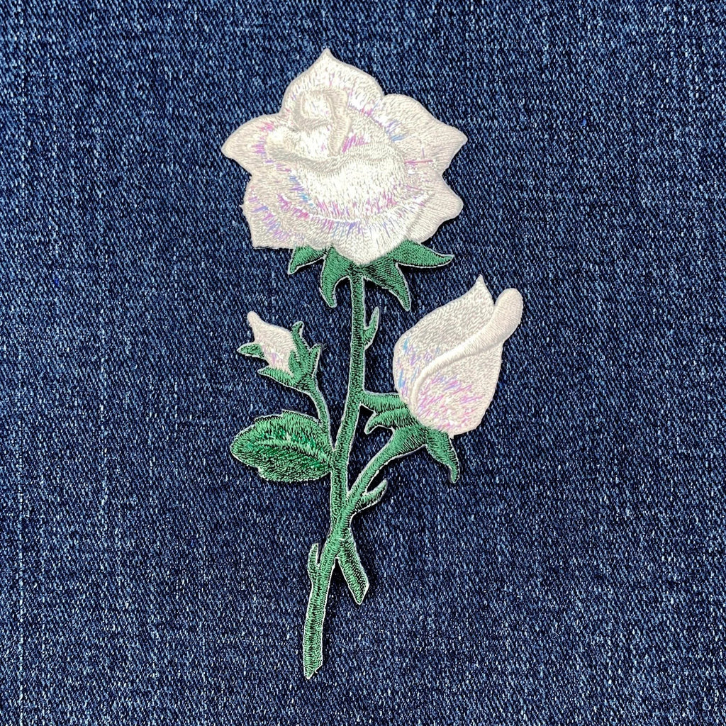 White Rose Applique Patch - Embroidered Flower Badge 4.75" (Iron On)
