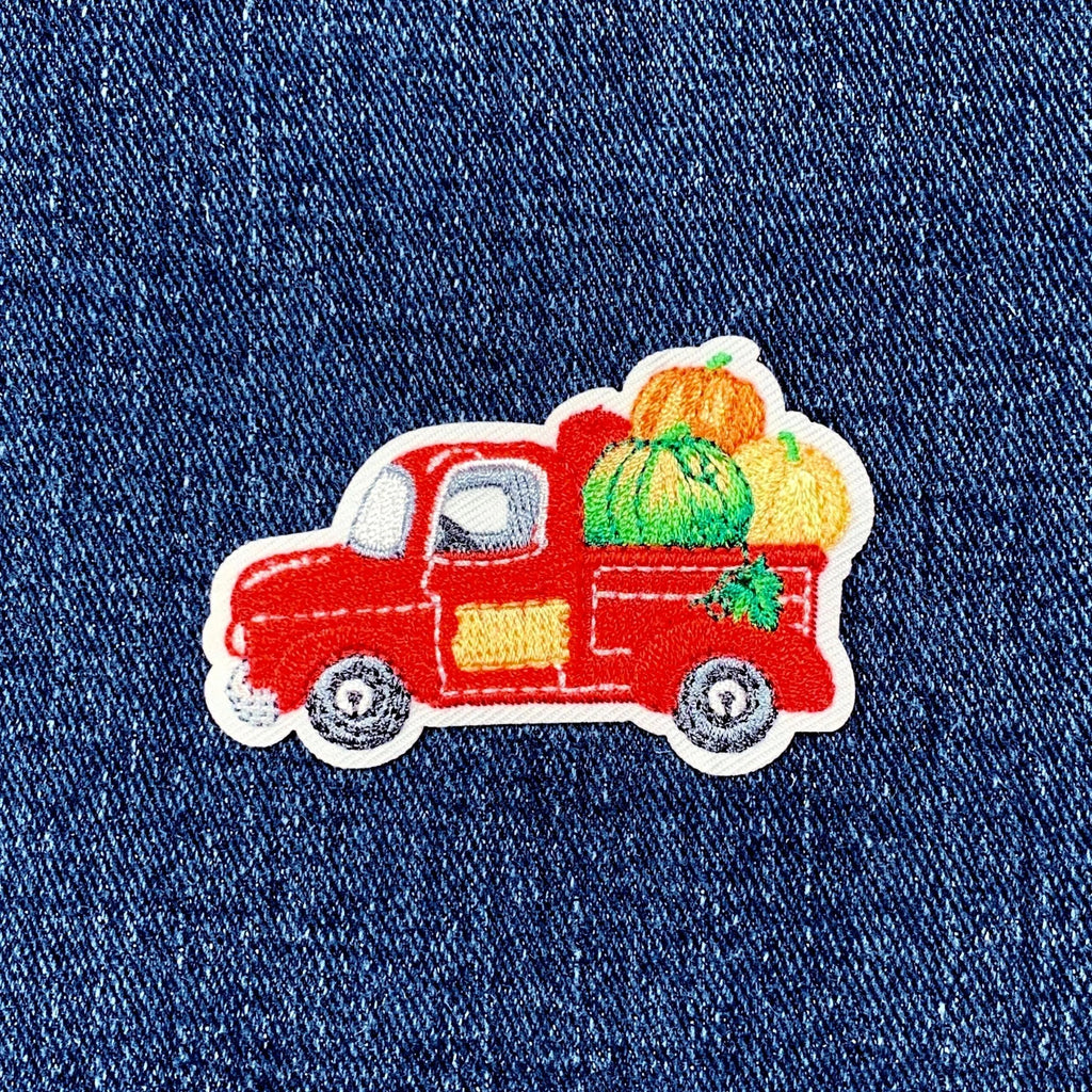 Red Truck & Pumpkins Applique Patch - Embroidered Autumn Fall Harvest Badge 2-1/8" (Iron On)